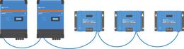 Cuando estén conectados entre sí, los controladores de carga sincronizarán sus fases de carga. También pueden mandar sus datos, a través del mismo cable, a un dispositivo GX (como el Cerbo GX) para su seguimiento.